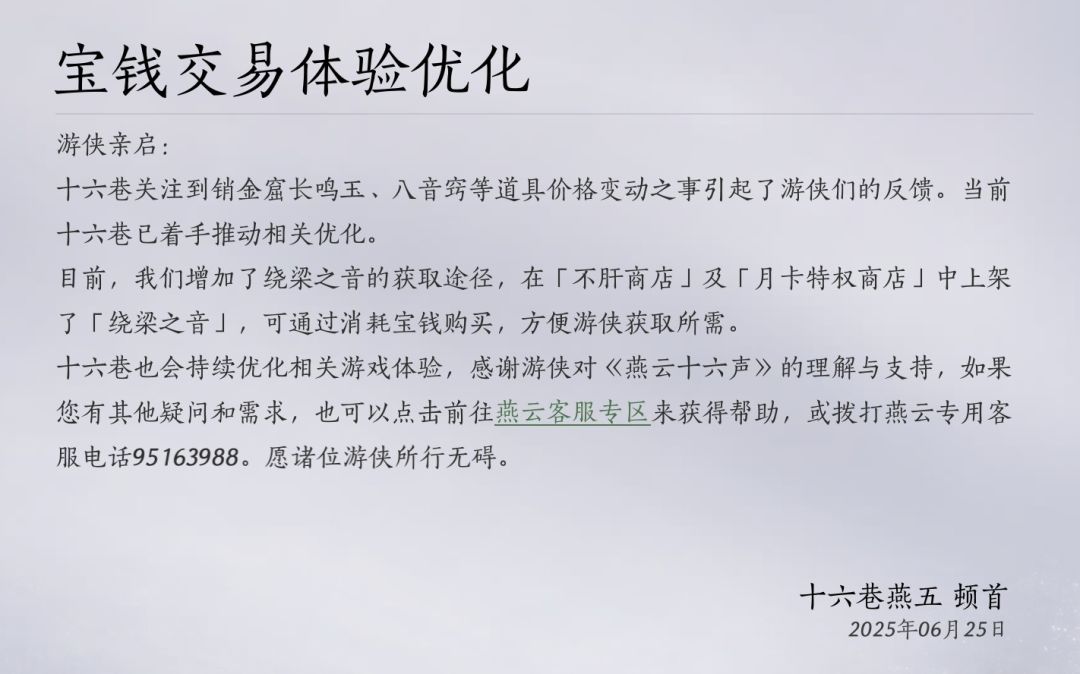 就在昨天6月25日,官方对于八音窍与长鸣玉价格疯涨问题发了封邮件,要优化市场,并在不肝商店与特权商店上架了「绕梁之音」。![[TapFamily_看戏]](https://img-tc.tapimg.com/market/images/81393719ec733f589d6753db27572595.gif)