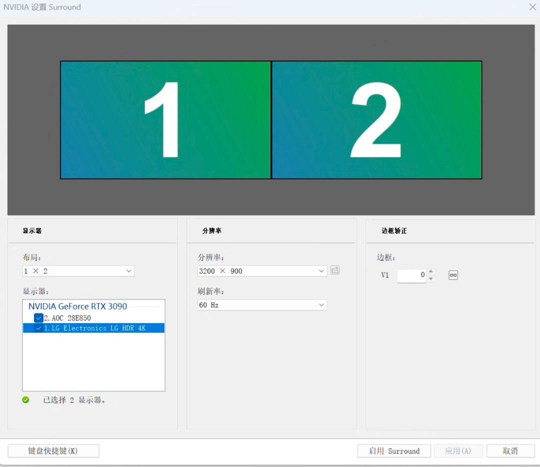 方法其实很简单,需要用到英伟达的控制面板中的Surround功能。桌面右键进入英伟达控制面板。点击左侧的“配置Surround选项”,勾选“Surround跨越多个显示器”。勾选之后点击配置,勾选列表中的两个显示器,布局选择“1×2”并点击启用Surround。