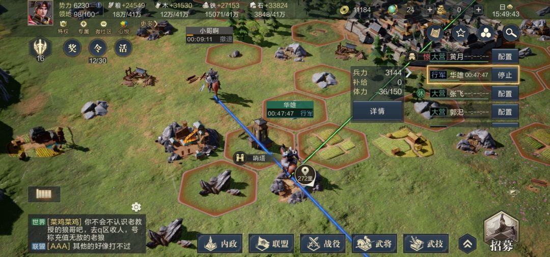 1、好好利用新手期。最开始新手期的时候每次出征只消耗武将5体力,而且休整期非常短,基本上只要你有兵就可以不断向外发兵,好好利用新手期的这段时间,就算是战败了也没关系,而且,新手期就算战败了也会返还你一定量招募士兵的资源。