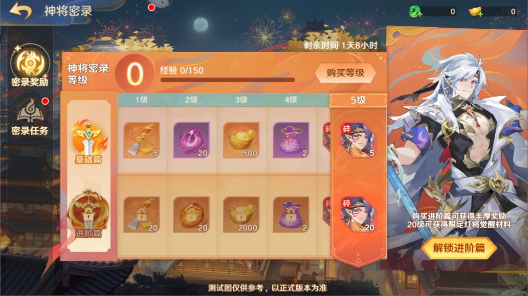 完成密录任务获得经验就能够提升神将密录等级,达到一定等级就能免费获得基础篇的对应奖励,包括天工刻刃*20、通臂猿猴碎片*20以及元宝、精炼石、随机宝石袋等道具。