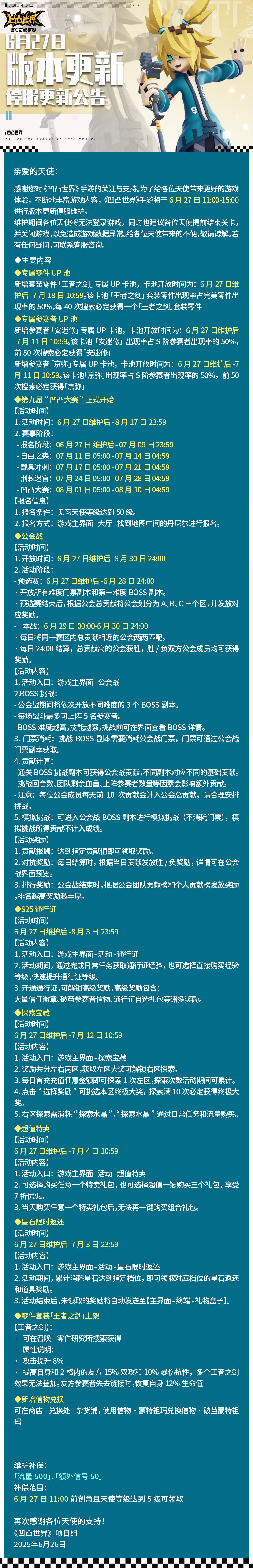 感谢您对《凹凸世界》手游的关注与支持。为了给各位天使带来更好的游戏体验,不断地丰富游戏内容,《凹凸世界》手游将于6月27日11:00-15:00进行停服维护。