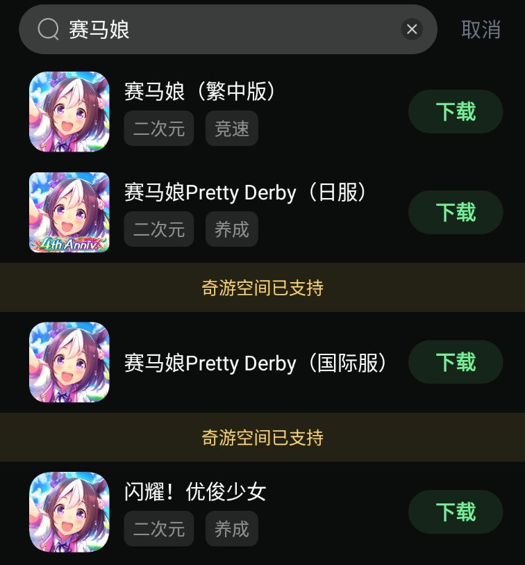 第三步:在奇游内搜索【赛马娘】即可下载游戏 日服、繁中服、国际服、国服都能一键下载!