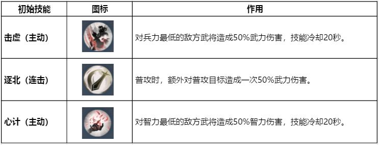 首先要和各位萌新说的是初始的B级技能,除了拆迁队的几种攻城技能之外,B级技能只需要研究心计,击虚以及逐北这三种就够了,剩下一切有关内政的全部不用看。为什么要特意提一下B级技能,因为研究B级技能也是需要吃蓝卡的,与其吃这点蓝卡研究了一堆没用的技能,不如让这些蓝将转化为技能点,为初期开荒的武将升级技能。