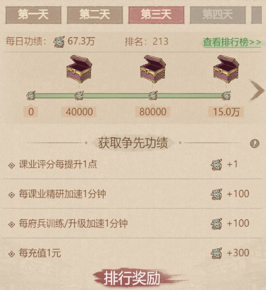 最后两天靠训练府兵和使用训练加速获取积分,这是决定总榜排名的关键阶段,需要大量训练加速道具。之前积累的加速可在这两天集中使用,快速提升总分。注意活动在第五天结束,不要错过最后冲刺。