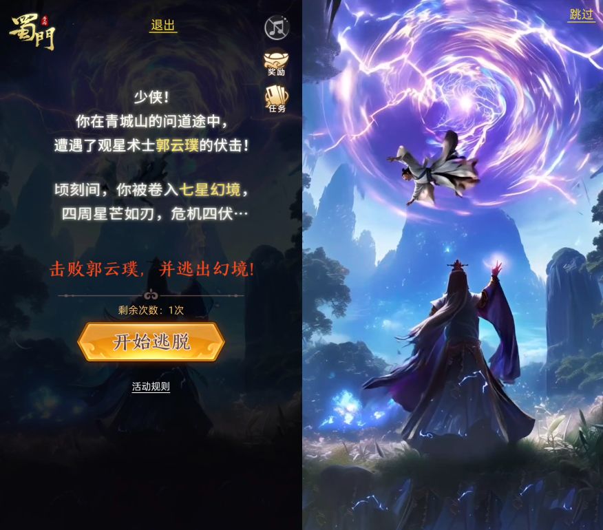 1、天雷阵阵,浓雾渐起!你在青城山问道途中遭遇郭云璞的伏击,被卷入七星幻境。点击“开始逃脱”即可开始游戏。
