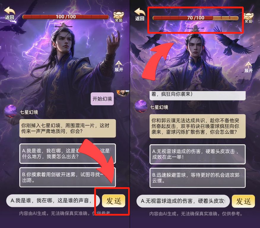 3、每触发一个场景后,你可以选择点击选项并发送答案,触发后续结果;也可以自主输入你想做的事情,会触发不一样的结果!郭云璞血量为零的时候即为逃脱成功。考验大家战斗能力的时候到了,日常在副本里大杀四方,小小郭云璞一定也不在话下!