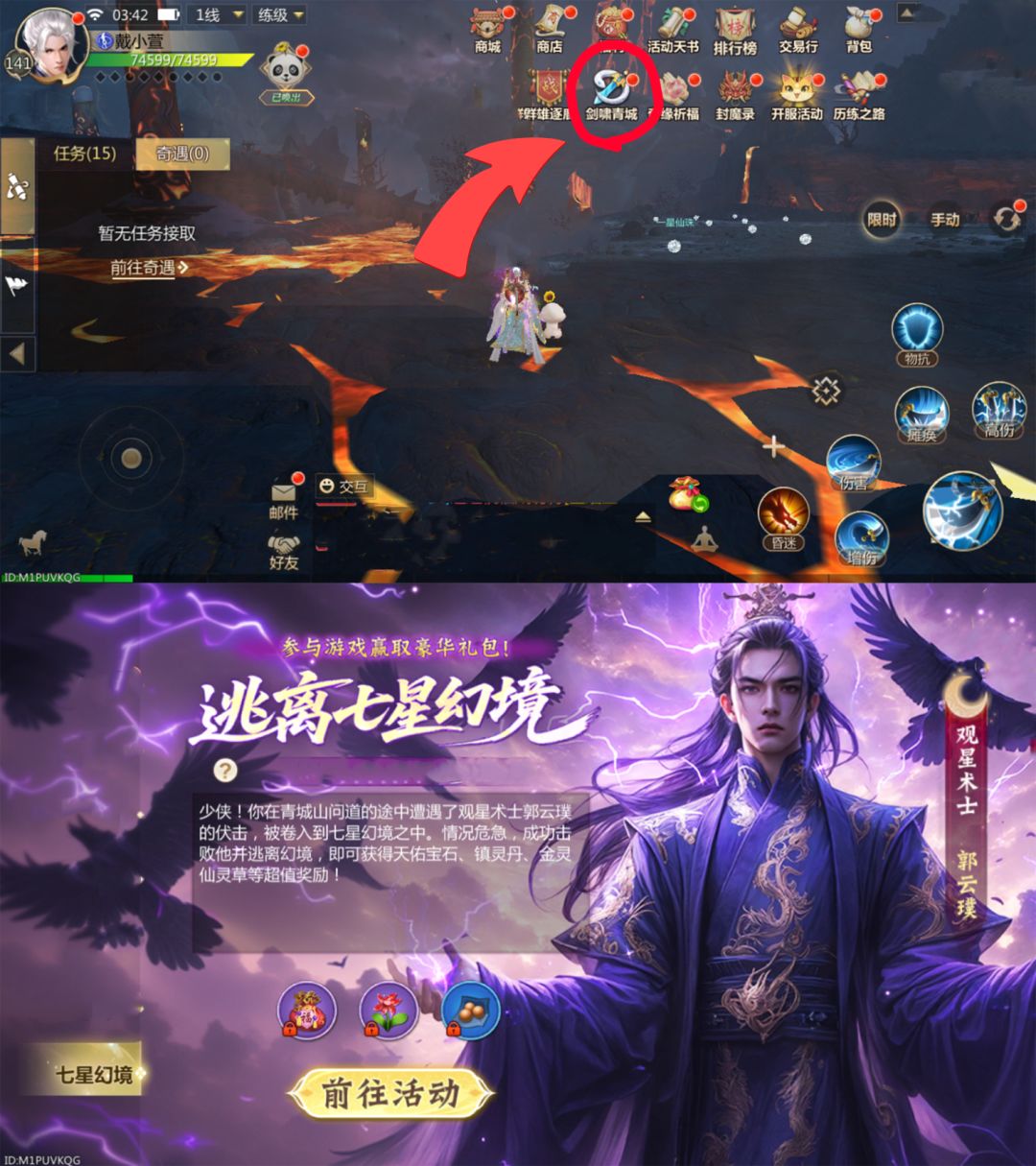 - 游戏首页右上角点开【剑啸青城】页签,选择 “七星幻境” 活动点击【前往活动】跳转专题页;