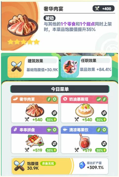 食堂内4个菜式的菜品各有不同,不同的搭配也会产生不一样的效果,建议根据菜品的被动进行搭配,从而提高矿产量~