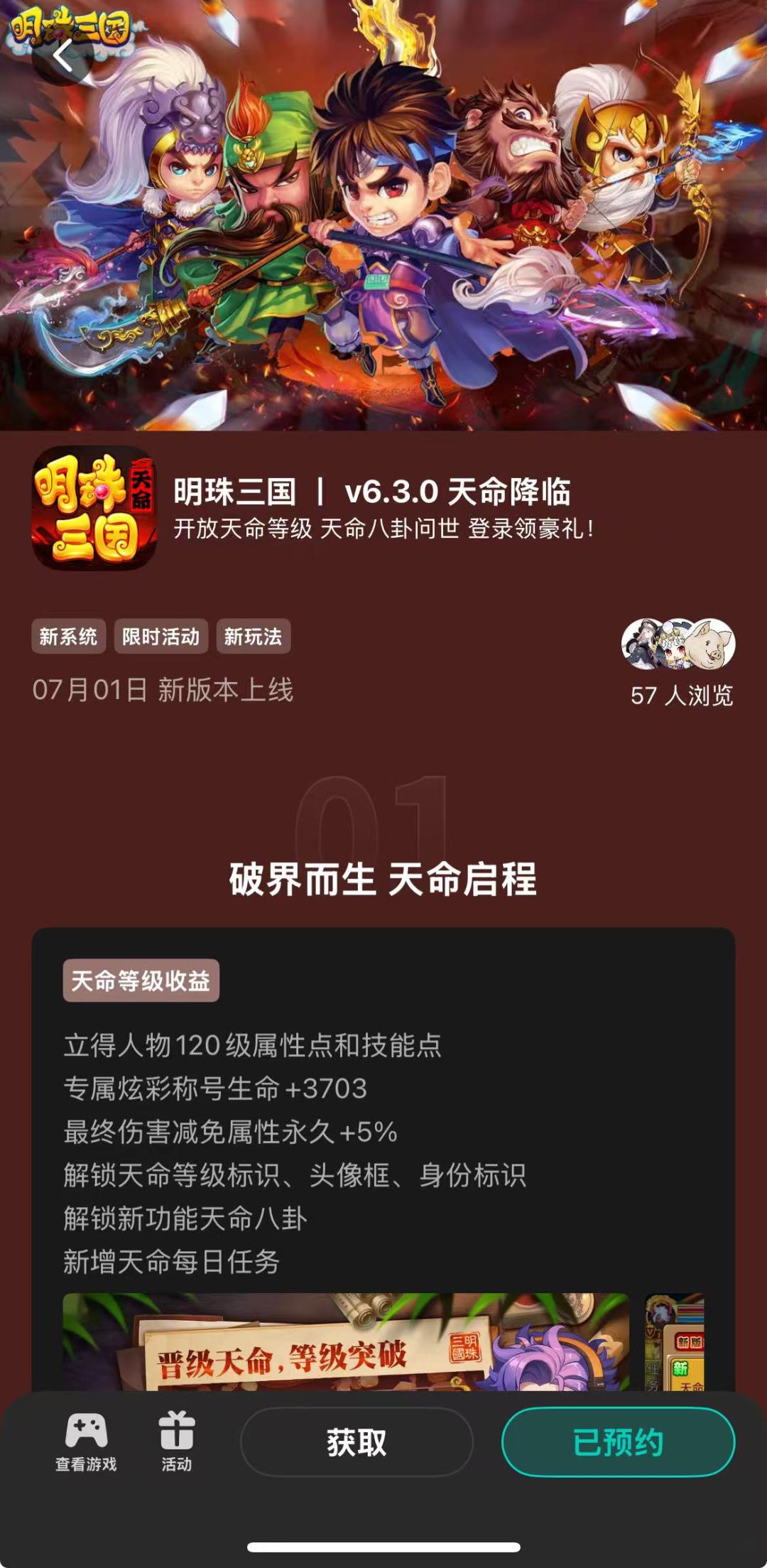 进入TapTap→搜索《明珠三国》→点击新版本v6.3.0“破界而生 天命启程”进入→预约新版本→点击“预约”→截图。