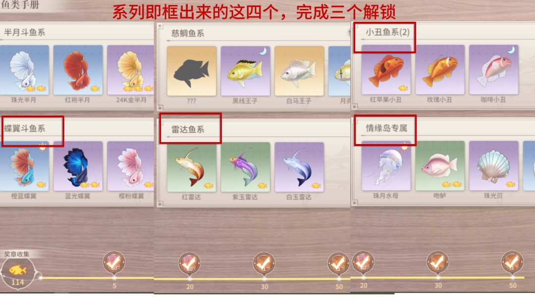 解锁系列图上这4个系列任3个,就能解锁④鱼点