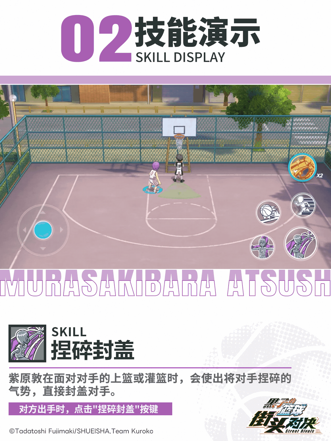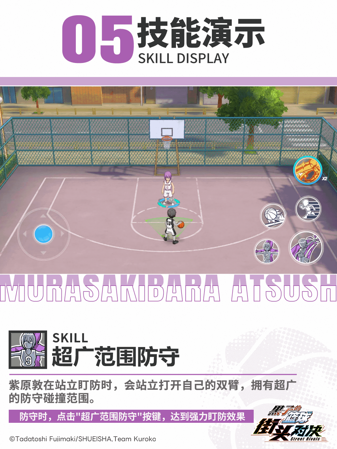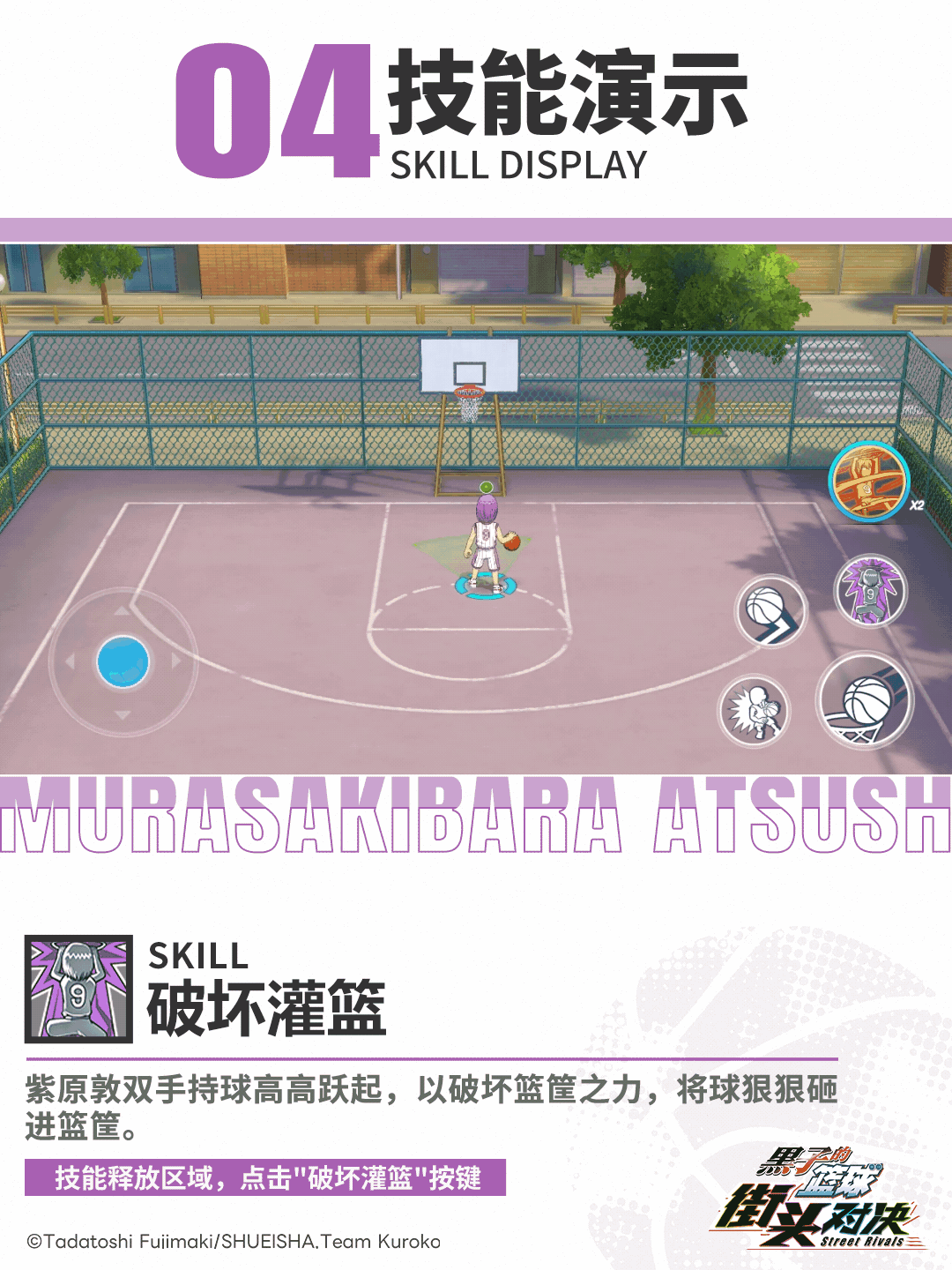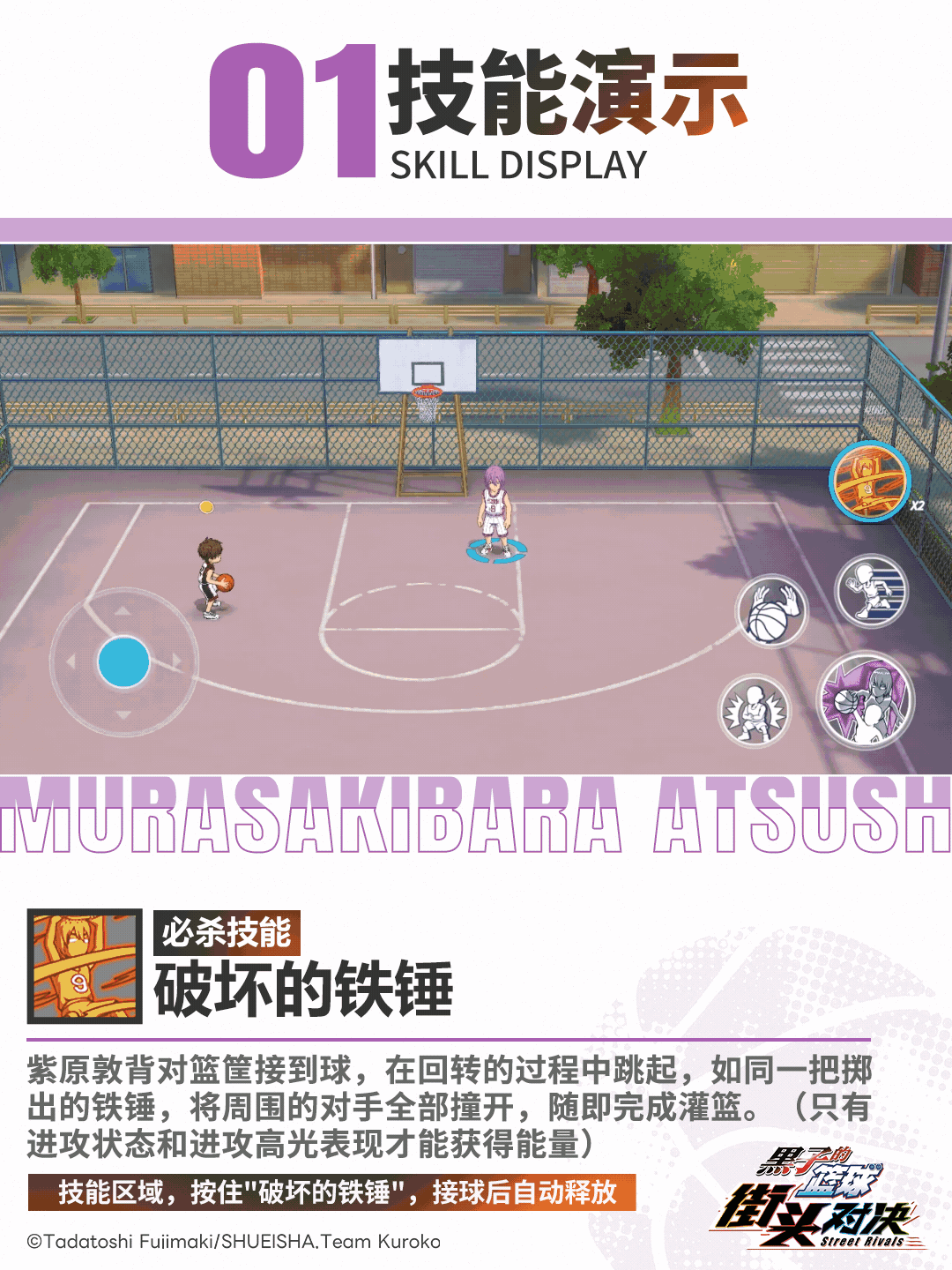 紫原敦背对篮筐接到球,在回转的过程中跳起,如同一把掷出的铁锤,将周围的对手全部撞开,随即完成灌篮。(只有进攻状态和进攻高光表现才能获得能量)