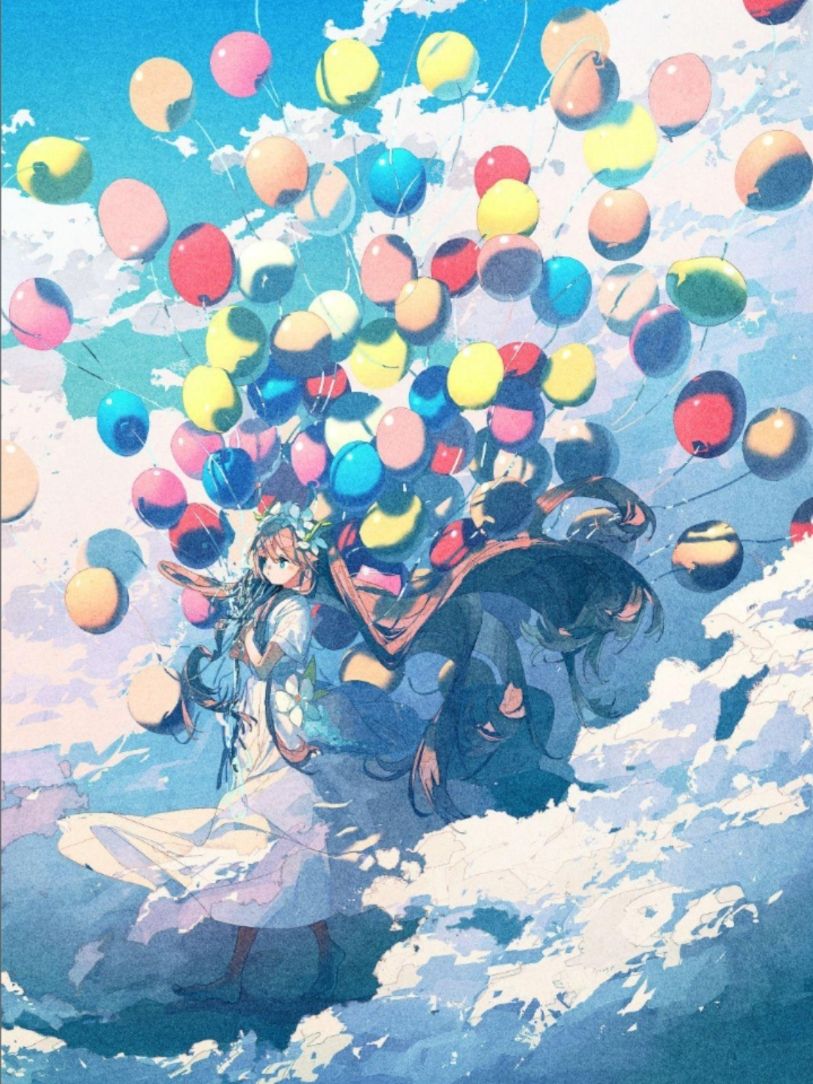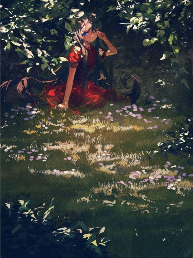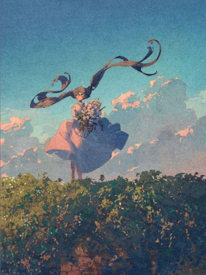 potg的作品风格独特,她喜欢在树叶、草地、云彩等景物轮廓上绘制淡淡的描边,增加了画面的精细度。为了凸显光感,她让画面中的许多元素呈现出高透光的质感,如少女的头发、肌肤、裙摆等,这些处理都增强了画面的曝光效果。此外,potg还喜欢在画面中添加噪点,这种处理方式使得画面既有喧嚣感又保持宁静,形成了一种独特的矛盾美感。