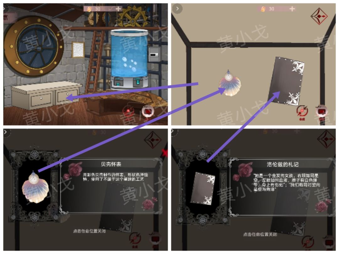 1.点击白色柜子,打开抽屉,获得【贝壳怀表】和【洛伦兹的札记】