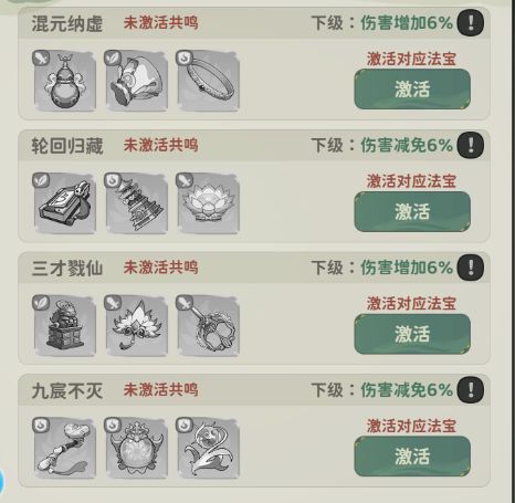 同时也可以激活法宝共鸣,也可以理解为法宝的套装属性,可以增加攻击,气血,防御等属性,四个品级都有对于的法宝共鸣属性加成。