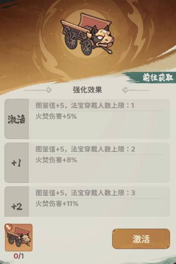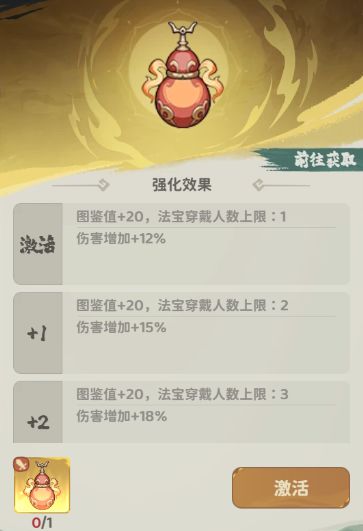 获取法宝主要以激活图鉴优先,全图鉴激活可以升级图鉴等级提升战力属性。