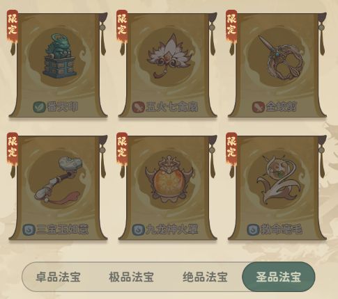 首先我们要区分好法宝的品阶,目前主要分为四大品阶:卓品,极品,绝品,圣品,其中圣品法宝里还包含限定圣品法宝。
