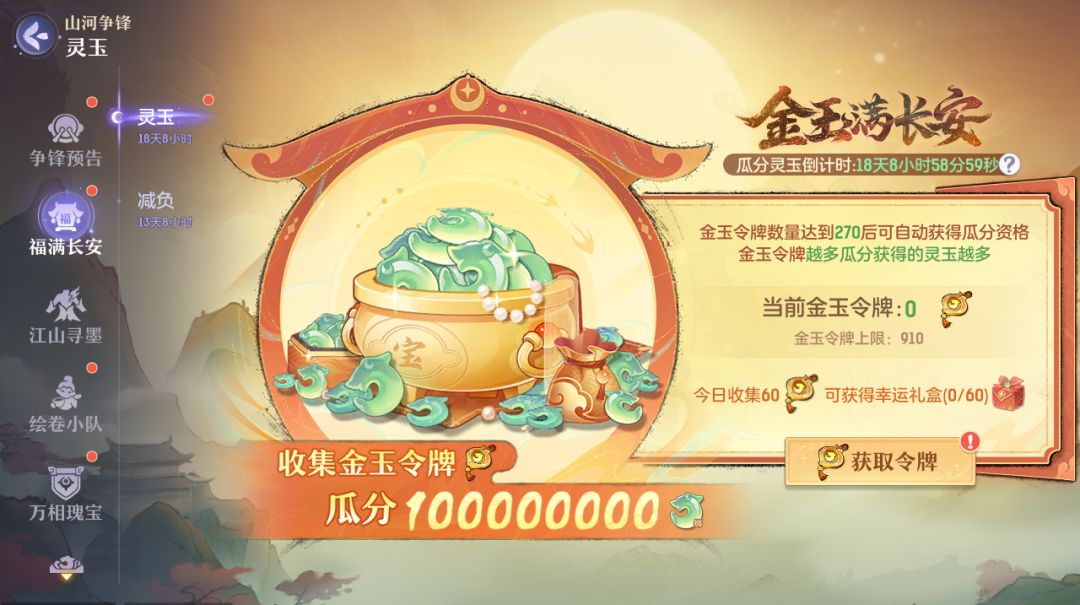 完成活动任务可收集金玉令牌,收集一定的金玉令牌,即可参与瓜分一亿绑玉!