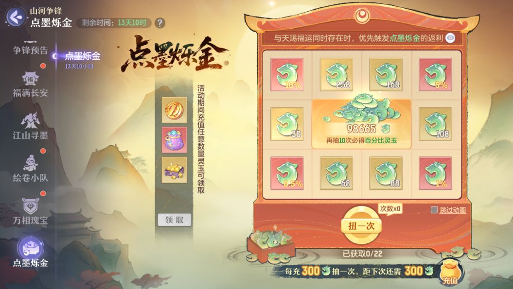 活动期间内,首次充值即可获得奖励一份。每累计充值一定额度灵玉,即可参与抽奖,抽奖过程中有几率抽到百分比灵玉奖励,获得灵玉奖池对应百分比数量的灵玉,灵玉奖池额度将由本服的御灵师共同提升!