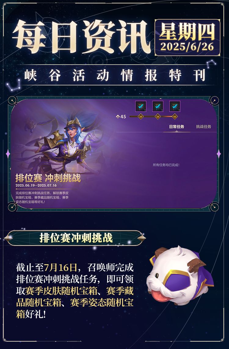 6月27日(明日)10:00-7月16日23:59活动期间,召唤师邀请好友组队,选择排位或者娱乐路线进行对局,完成对应任务即可解锁个性化宝箱、海克斯能量卡、龙魂水晶等多重奖励!