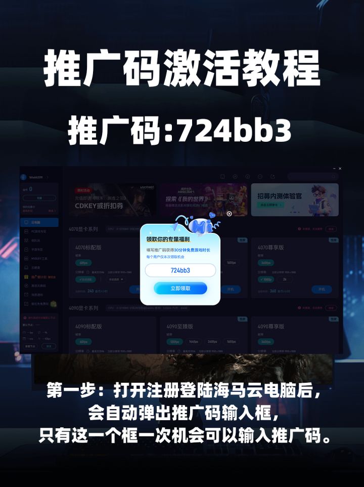 第一步:打开注册登陆海马云电脑后,会自动弹出推广码输入框,只有这一个框一次机会可以输入推广码。