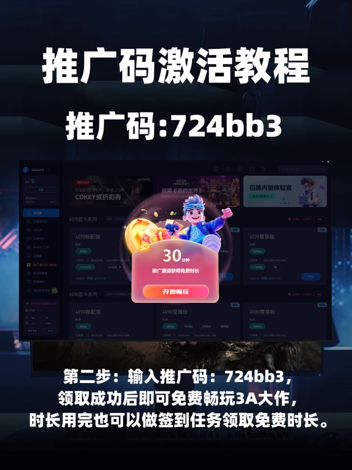 第二步:输入推广码:724bb3,领取成功后即可免费畅玩3A大作,时长用完也可以做签到任务领取免费时长。