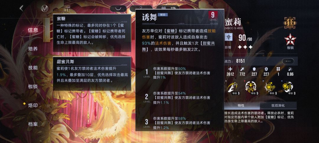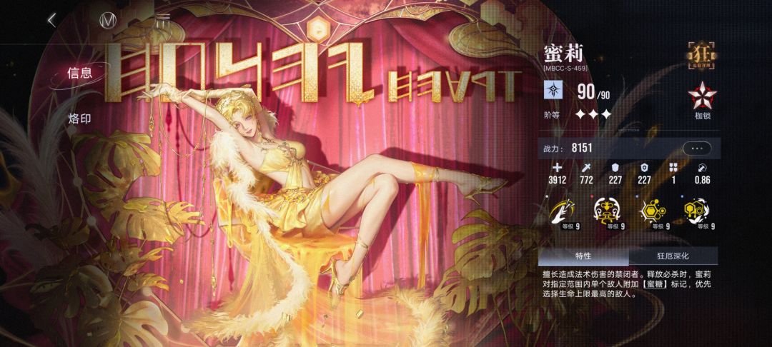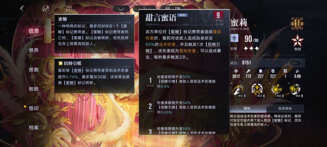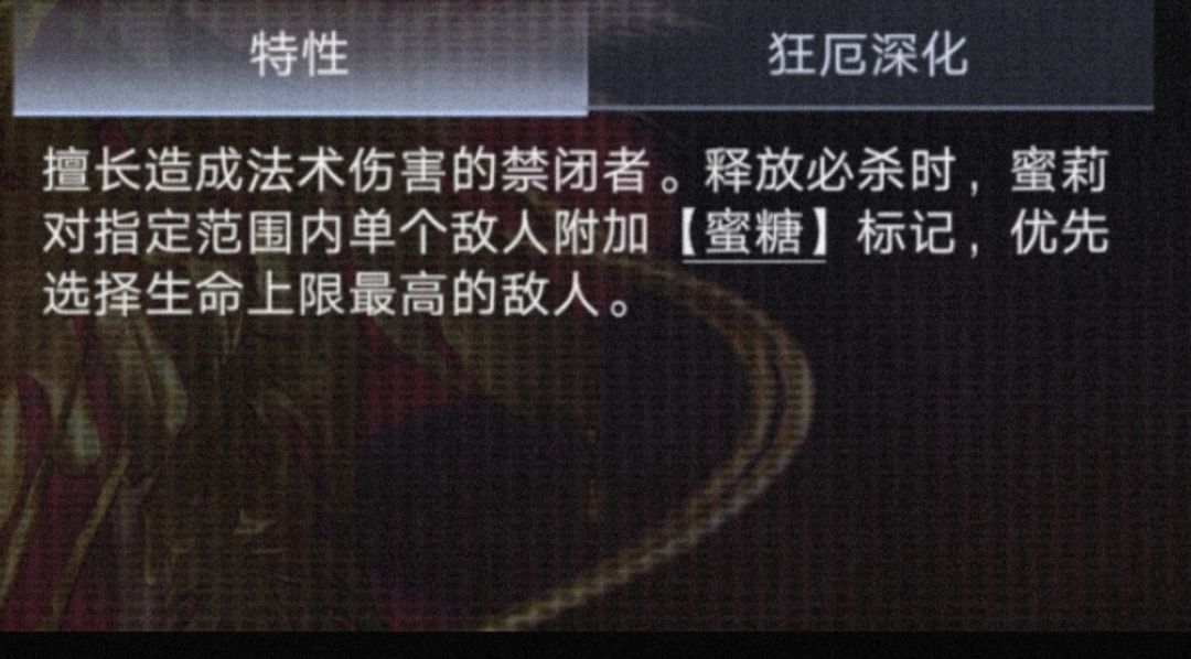 【蜜糖】释放必杀时给必杀范围内生命值上限最高的敌方单位附加蜜糖标记(蜂蜜环状 血条下面的黄色标记是法术易伤层数),场上唯一,标记单位死亡后转移到场上生命上限最高的敌人身上,持续时间永久。