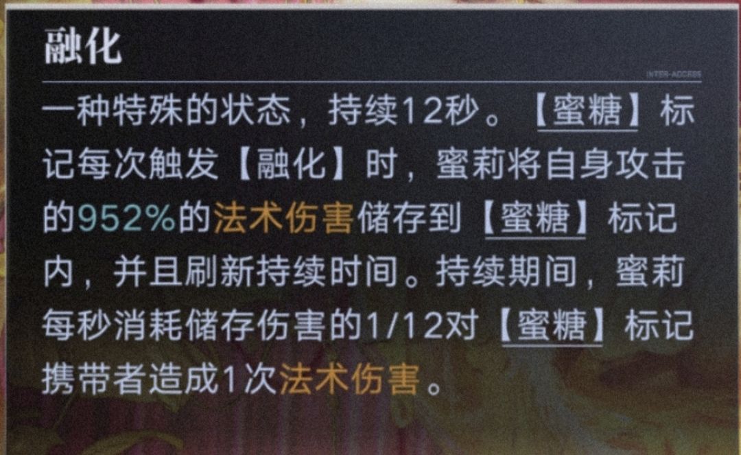 释放必杀和专烙还会给【蜜糖】标记增加一次【融化】伤害效果类似【生命流逝】、【燃烧】这种,特点是反复触发【融化】不会损失伤害。