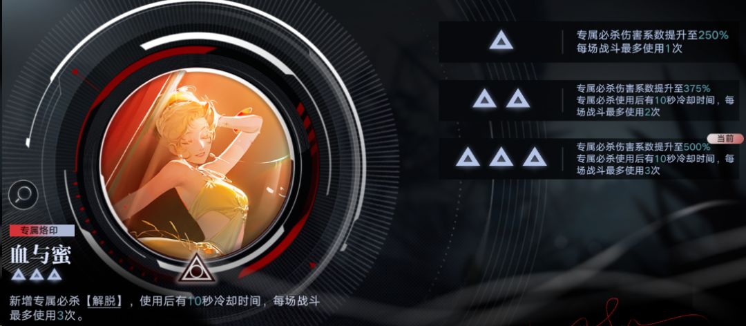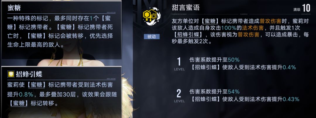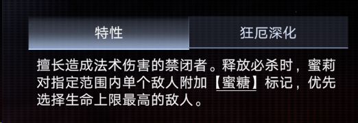 蜜莉的特性抛开乱七八糟的我们就看到这个蜜糖,是通过必杀(专烙不行,下面会说)给范围(九宫格)生命值最高的敌人挂上标记蜜糖,老斯老斯,这个蜜糖是什么意思,🤓☝🏻诶,蜜糖就是一种标记,而这个标记全局最多同时存在一个,而蜜莉接下来的一切都围绕着这个蜜糖展开