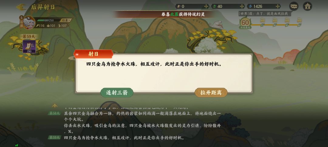 兄弟们大家好呀,我是大迷,在这里给大家分享一下山海传奇后羿射日的通关攻略。这个活动玩法主要就是要通过大家自己的抉择,给活动里的角色增加属性,从而达到通关或者阵亡的结局,我这里就选几个重要的抉择给大家看看,一些小的抉择就不说了。