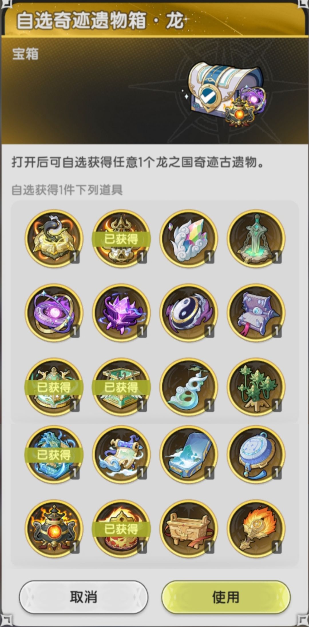 活动奖励分为五级,在每个等级依次消耗240/400/600/800世界树能量兑换一个宝藏即可解锁下一等级的封印宝藏(无需将该等级封印宝藏全部兑换),本期活动的五级封印宝藏是自选奇迹遗物箱·龙 Ⅰ 乾坤造化,星之契40抽和女神的金牌40个(4抽)。