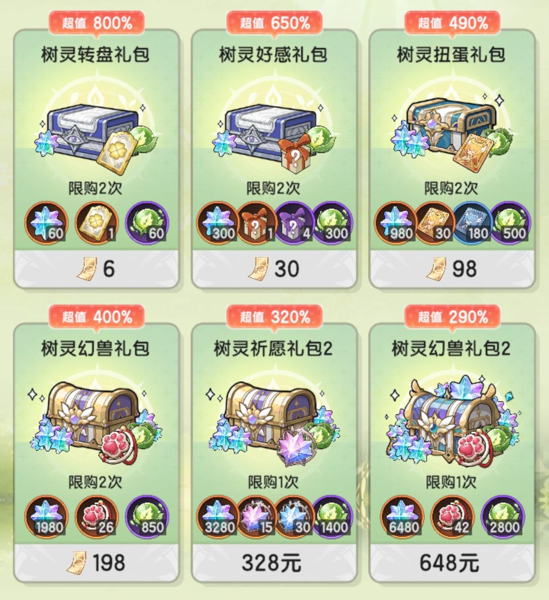 活动参与方案⑨:考虑氪金,打算本期秘宝大作战五层奖励均拿完,需补氪一个648礼包(1*2800),一个328礼包(1*1400),两个198礼包(2*850),两个98礼包(2*500),两个30礼包(2*300),会多出30能量,共消耗1628元;(全)