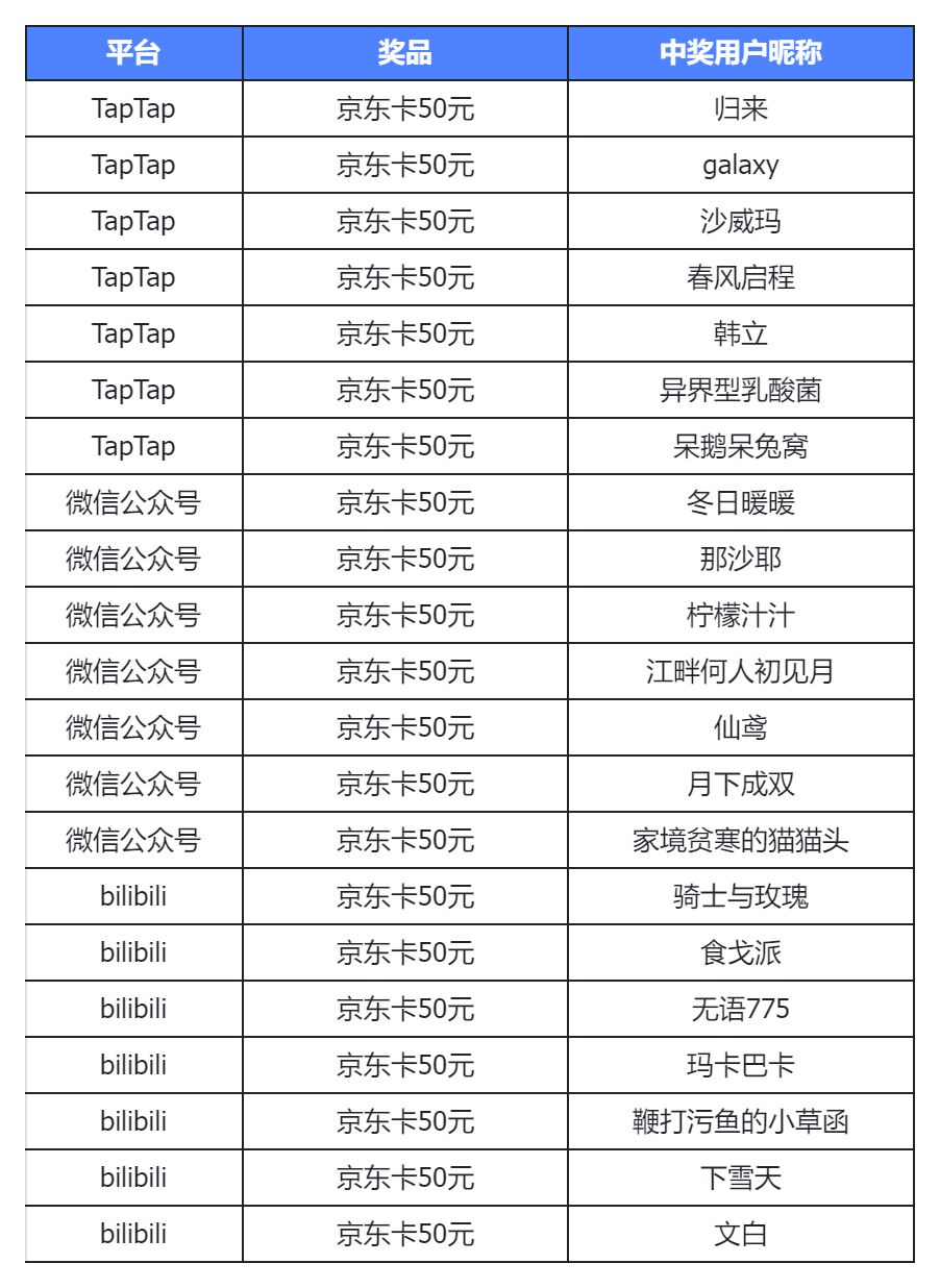 1.活动结束后抽奖结果将在官方TapTap社区发布公示;