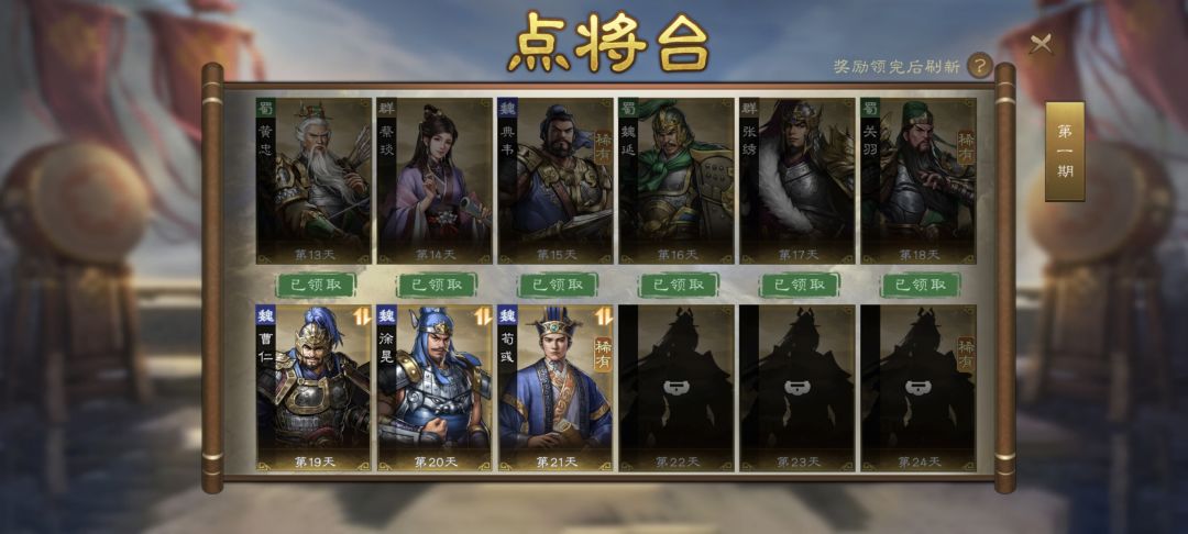 点将台,最新推出的福利系统,每个月签到就送20金+9稀有+1无双卡,助力平民全图鉴,因为目前普通金卡就是20张,所以可以随便选都可以开图鉴,而稀有因为目前一共16张,所以是16选9,可以优先选自己需要的核心稀有卡,然后再开图鉴,开图鉴加战力,无双没什么好说的,每个月出一送一。