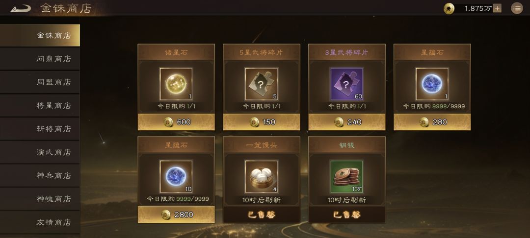 金珠商店:买免费包子即可,后期可能(只是可能)出现缺铜钱的情况,可以考虑1千金珠买100万,其他都不需要买,然后万氪(注意是万氪)以上可以每天买600的黄抽和150的橙碎片