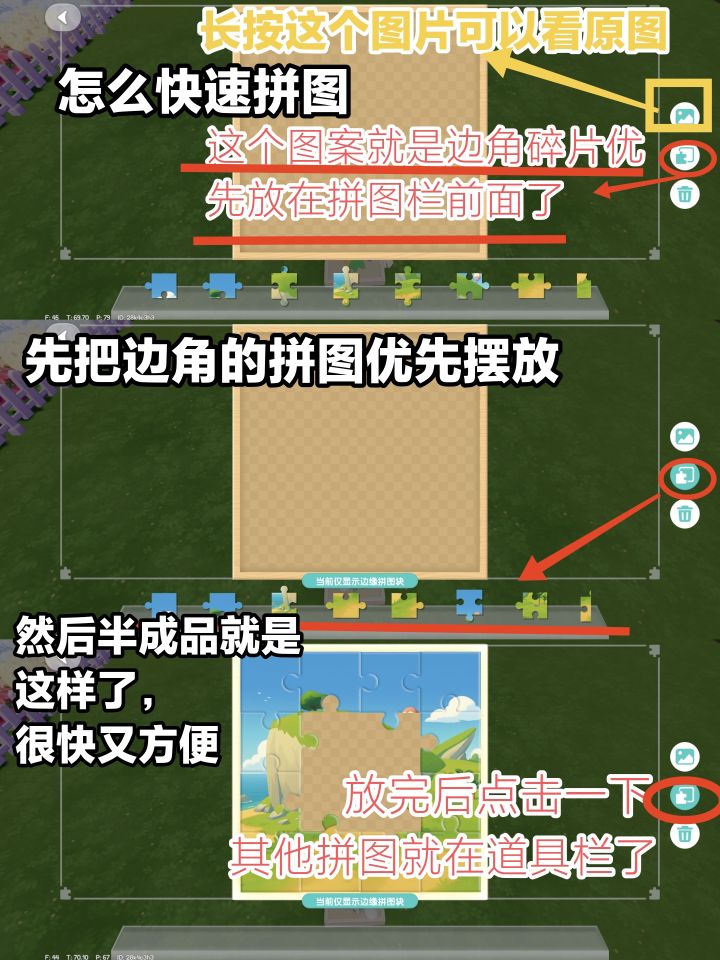 🧩快速拼图法优先摆放边角图,快速成型,然后点击原图一边看一边摆,空白区域也可以放图哦