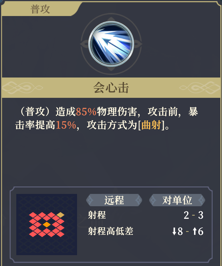 - 暴击率提高 8% / 12% / 16% / 18% / 20% ;对任意已方4格内的敌人([大型角色]按最近格计算距离)攻击时,暴击率额外提高 20% / 24% / 28% / 34% / 40% 。