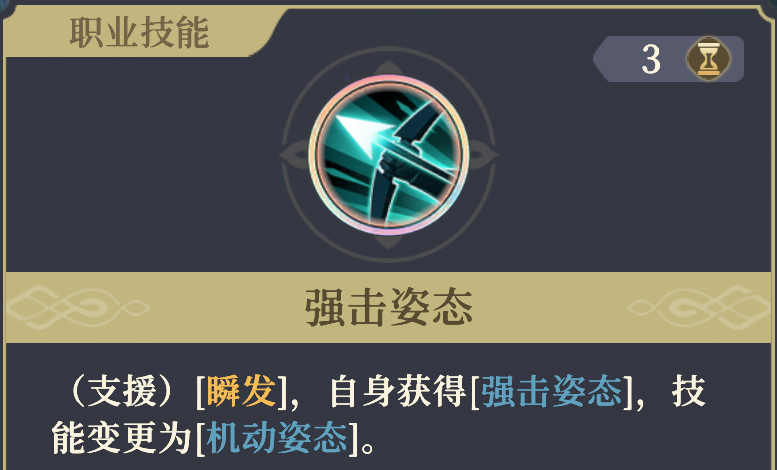 - 技能“机动姿态”在获得后有1回合的预冷却。释放技能“机动姿态”后,再移动的格数为当前移动力。
