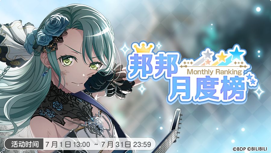 游戏内现已开启7月【邦邦月度榜】,通过完成演出将可获得「邦邦月度榜Pt」,根据当月获得的「邦邦月度榜Pt」,可由「青铜段位」依次升至「白银段位」、「黄金段位」和「铂金段位」,到达对应段位后将获得该段位的奖励!