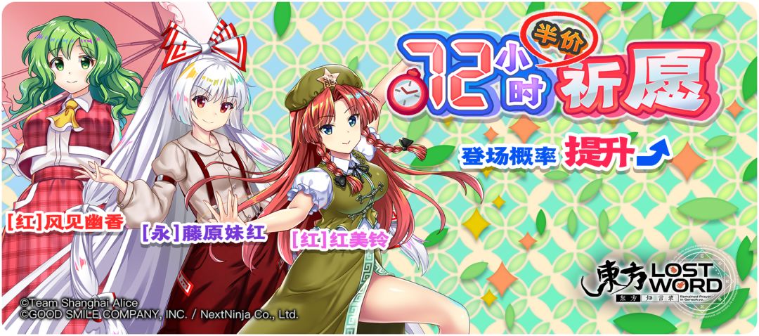 祈愿概率UP角色:[红]风见幽香、[永]藤原妹红、[红]红美铃
