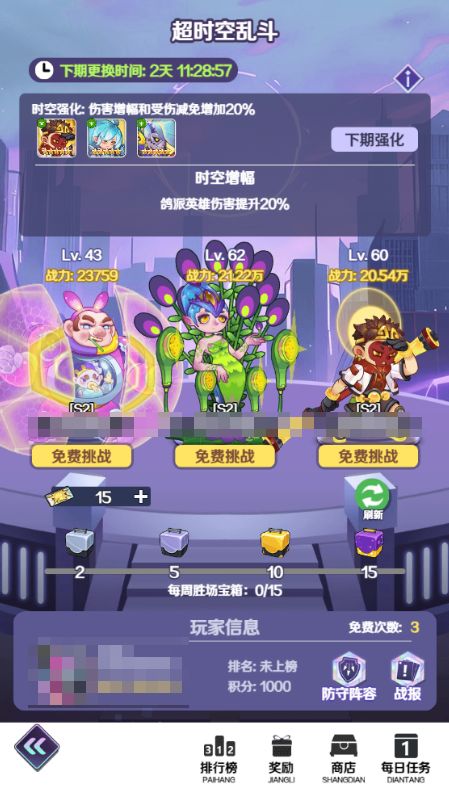 (1)时空强化:每周都会存在3名英雄,获得20%攻击和生命的加成,他们会在超时空乱斗中无往不利;