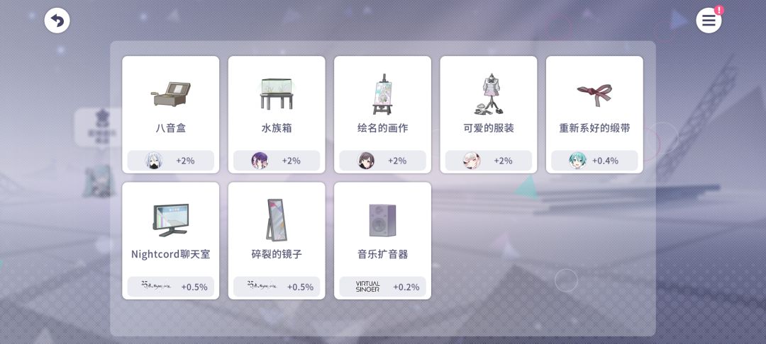 每个世界都有加成道具,当使用对应角色时可根据物品等级获得表演加成,通过耗费金币和道具进行升级。