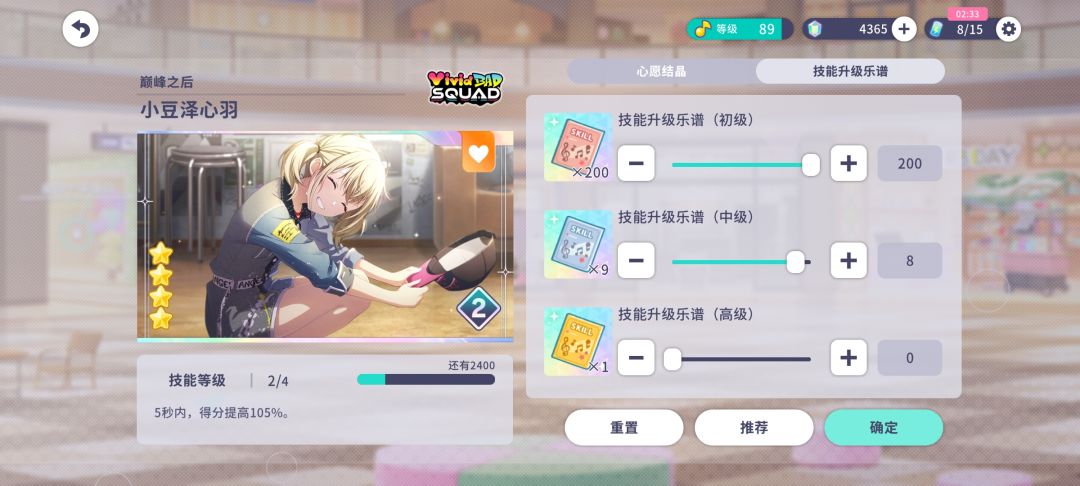 技能升级:使用心愿碎片,心愿结晶,或技能升级乐谱进行升级,可提升角色技能强度。