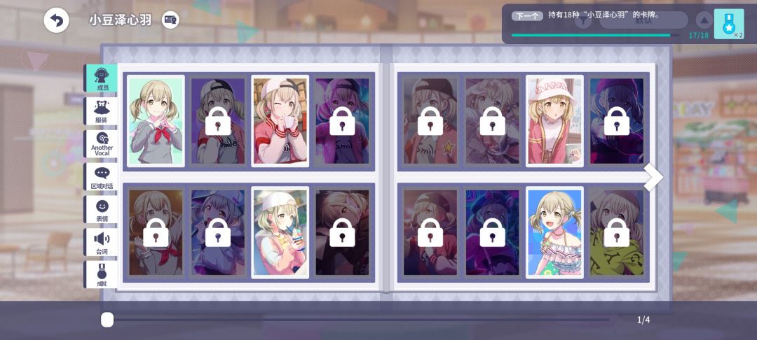 玩家可以查看所有角色的等级,选择任意角色后可查看角色的收集进度,每当完成一个进度可获得点数,点数足够后可升级该角色并领取奖励,使用该角色进行表演会获得角色等级加成。