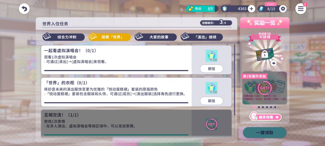 每个组合都有属于自己的世界,每个世界只会出现对应组合的角色以及虚拟角色团体。相比而言,现实世界可以看到更多角色,点击角色可以查看对话,并获得10水晶奖励。