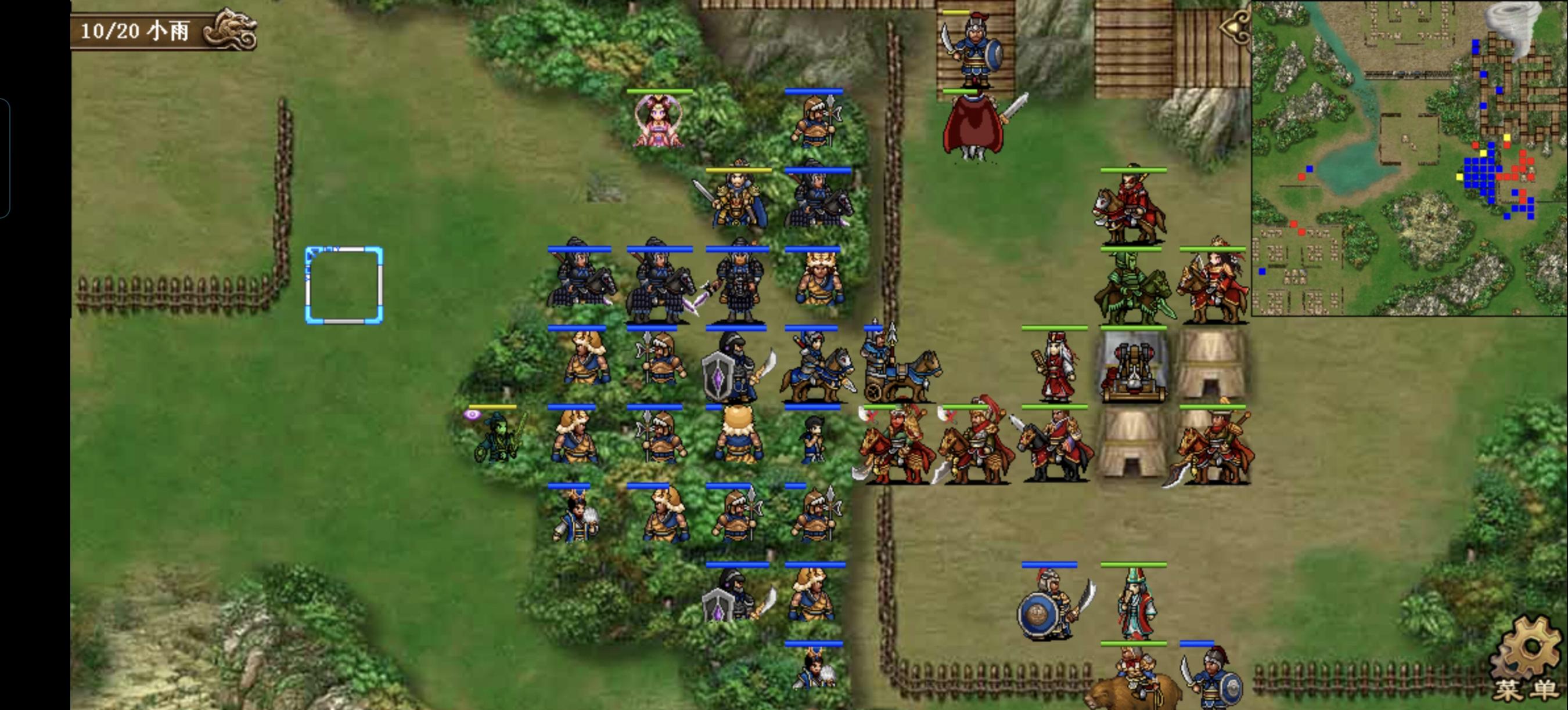 关羽原地打上方的枪兵触发大夏607的追击,邓艾到曹洪左侧衰气曹洪上方的虎啸军,许褚右移一格给貂蝉神秘酒,张辽到司马右侧援军貂蝉,荀彧右移一格风龙曹洪右侧两格的虎啸军,荀攸下来一格回归荀彧,荀彧到司马右侧风龙曹洪上方的虎啸军,典韦给郭嘉碧琳丹,再回原位变雨天,大夏到曹洪下方打上面的虎啸军,607到大夏下方两格打虎啸军,曹洪原地碰瓷虎啸军,追击击杀虎啸身后的丹阳兵。郭嘉到许褚下方两格给关羽角黍,曹操到张辽右侧两格往上刷两发海啸,再随步到张辽下方,张任右移给上面的虎啸军水龙,再去张辽右侧两格往上刷海啸。貂蝉下去给郭嘉救军,张郃冲到最上面的营地打弓兵,再回荀攸左侧两格打上面的虎啸军,再随步到邓艾左侧,司马原地援军张辽,貂蝉去荀攸左侧天雷张任上方的虎贲,邓艾到貂蝉左侧往左毒雾,张辽到貂蝉下方两格强行郭嘉,郭嘉去张辽右侧5格,准备撤离(这个位置有强行正好可以一回合到地图最右侧撤离)。