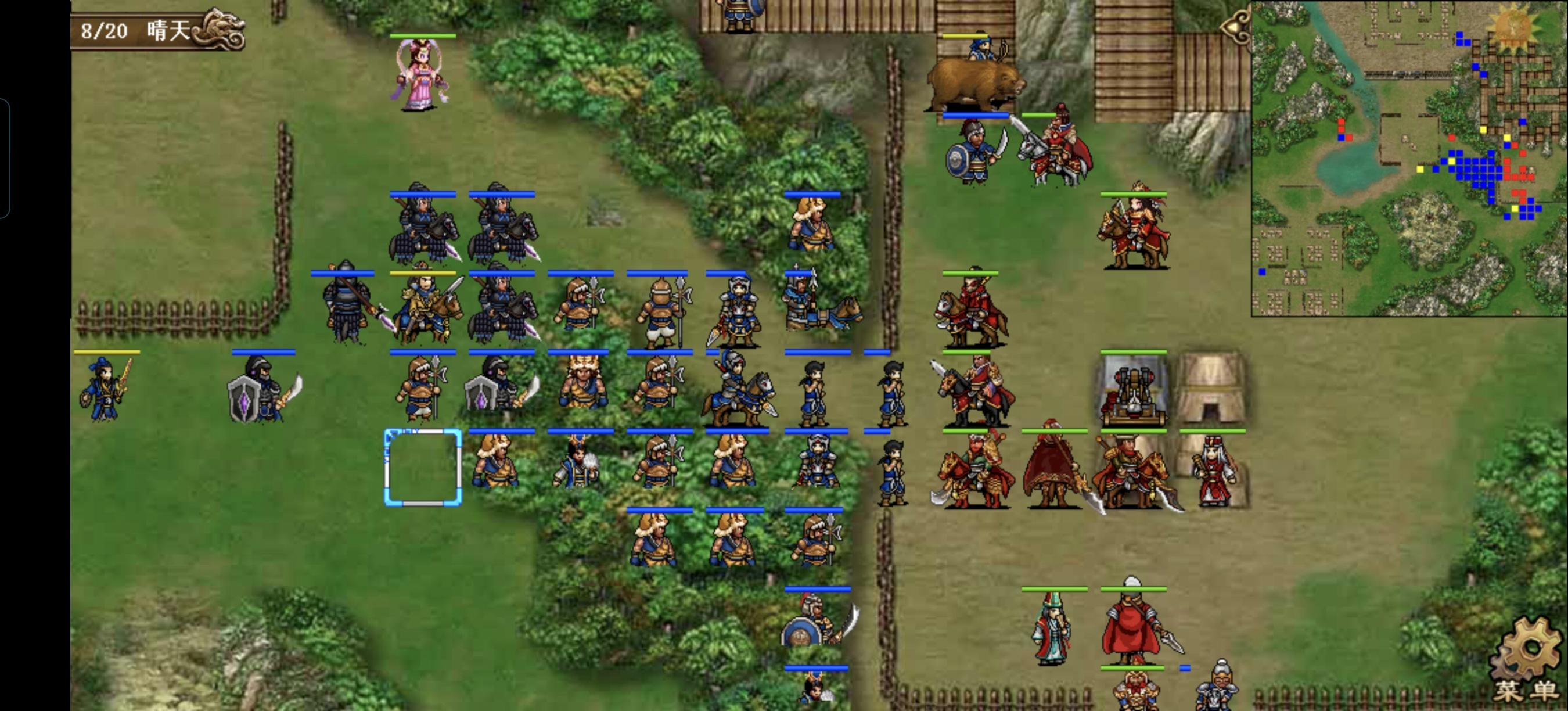 典韦先强行荀攸,再去曹操下方变雨天,张辽去曹操右侧给邓艾上方的象使混乱,貂蝉先给邓艾强行,再去张任右侧两格魅惑两个丹阳兵。叠满八赤的曹操在张辽buff加持下精神破千,到张辽上方往右狠狠的刷两发海啸,再随步到曹洪左下方,荀彧到张辽上方再往右刷海啸,荀攸回归后再刷一发。邓艾模仿郭嘉输送关羽,关羽往右退一格打亲卫队一下,许褚右退一格给关羽角黍,邓艾到许褚侧后方给许褚肉包。张辽去607上方给司马大补给,魅惑的丹阳兵打曹洪右侧的虎啸军,曹洪再打一下,触发607两次追击,大夏去曹洪右侧打残虎啸军,607原地穿二击杀两个虎啸军,张郃到司马右下方打残草寇,另一个魅惑的丹阳兵收头,再去曹洪上方三格打曹洪上方1格的象使,触发大夏最后一下追击,再随步去荀彧下方。张任去大夏右侧给曹洪上方的象使刷两发水龙,司马再加一下火龙,郭嘉救军奶曹洪,再回营地。