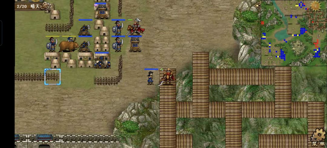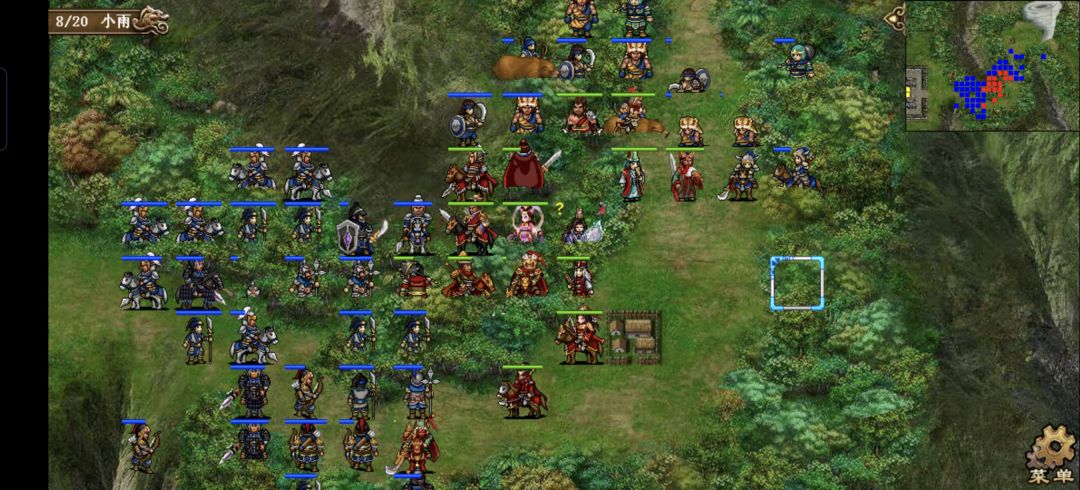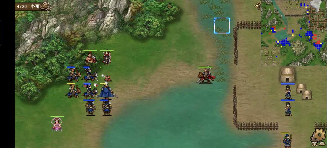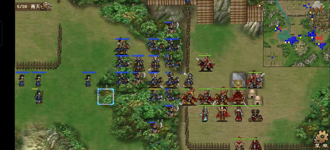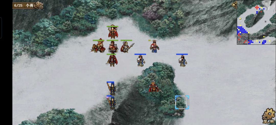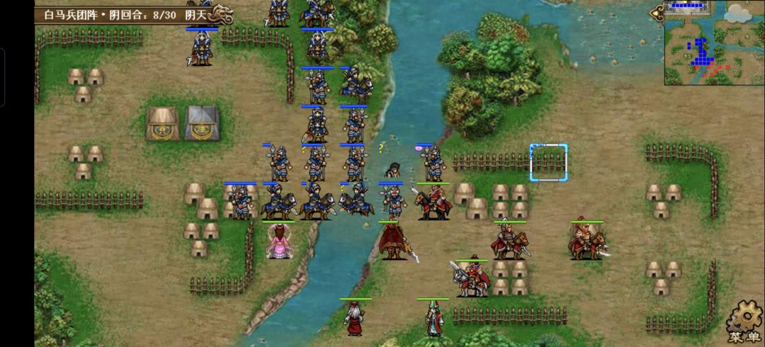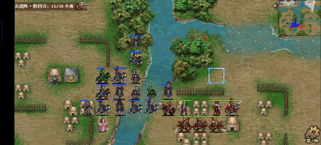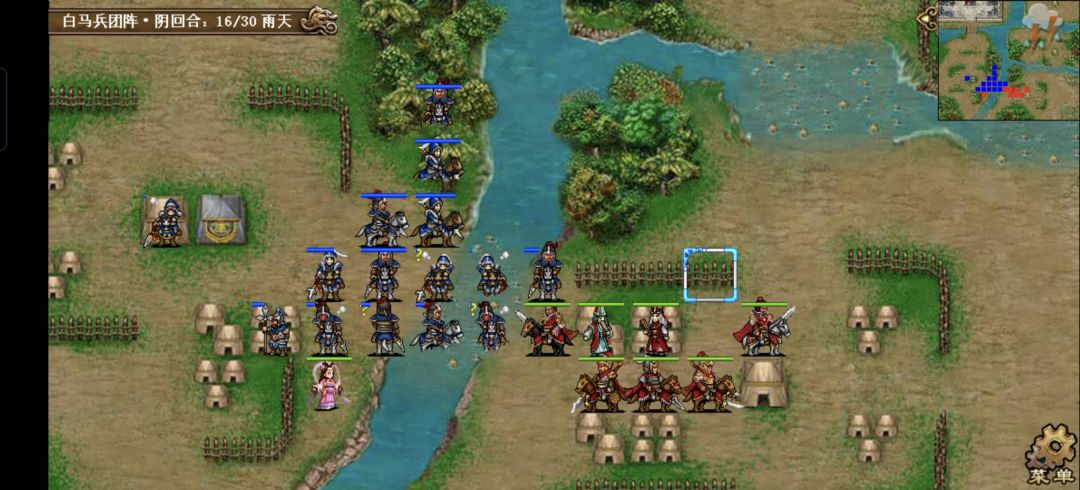 许褚原地碰瓷上方的枪兵,触发雨泽奶关羽一口,关羽原地打左侧的枪兵,张郃冲到(21,10)的位置打荀攸右侧的虎啸军,触发大夏607司马的追击,