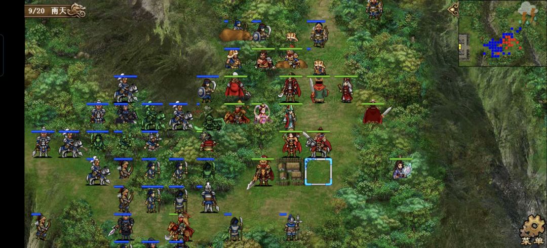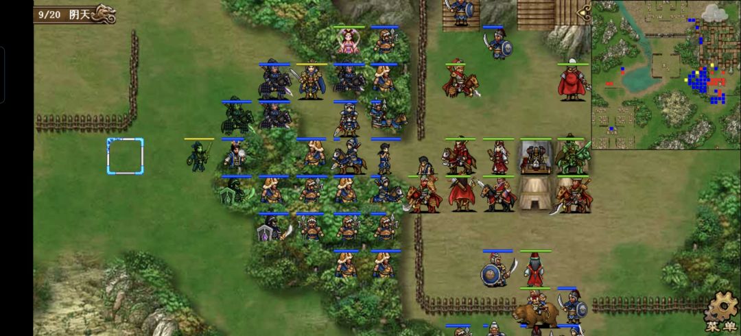 张辽右移一格谎报司马上方两格的草寇,张郃去张任上方5格打张任上方三格的丹阳兵,触发司马火龙追击,张任原地两下水龙这个丹阳兵,曹操到荀彧下方往上刷两发海啸,荀彧荀攸原地放风龙吹满9人。司马原地救队荀彧,张辽左移一格急救曹洪。典韦到张辽左侧两格衰气大夏左侧的驯兽,大夏去607左侧打驯兽,曹洪原地打右侧的驯兽,触发607追击击杀残血草寇,607再右移一格射大夏上方两格的驯兽,张郃到张辽左侧打驯兽,貂蝉再暖风张辽,给众人奶满血,再去大夏左侧魅惑上面的虎啸,丹阳,魅惑的虎啸丹阳都上移一格打自己右下方的小兵,触发大夏最后一下追击干掉驯兽。曹操随步到典韦左侧两格(这里又能挨两下打,叠赤影),典韦到曹操右上方衰气曹操上方的草寇,张郃随步到典韦右侧。邓艾模仿貂蝉毒雾许褚左上角的枪兵,再模仿郭嘉输送关羽,关羽右移一格打近卫兵,许褚右移一格给自己蟠桃。