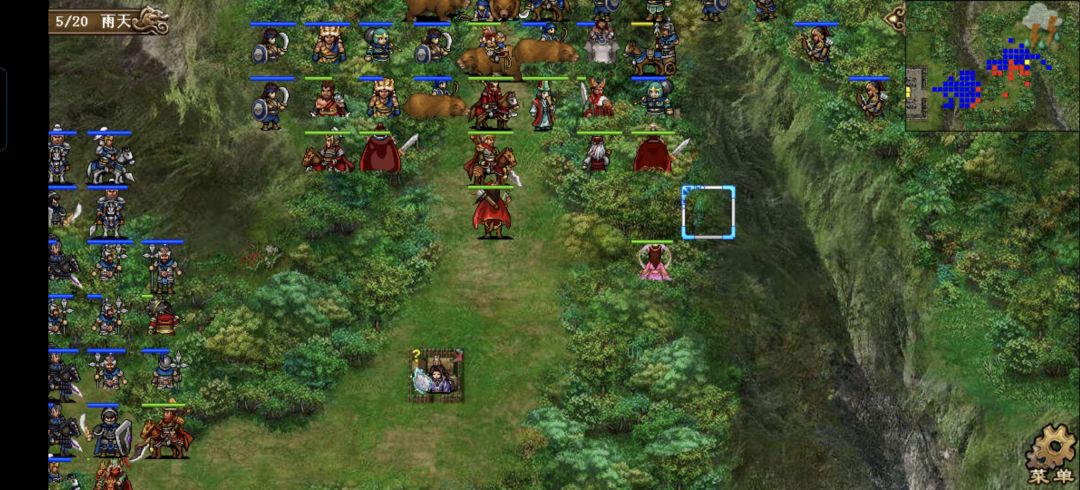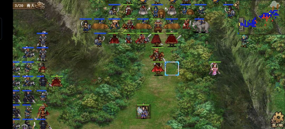 典韦先强行荀攸,再去曹操下方变雨天,张辽去曹操右侧给邓艾上方的象使混乱,貂蝉先给邓艾强行,再去张任右侧两格魅惑两个丹阳兵。叠满八赤的曹操在张辽buff加持下精神破千,到张辽上方往右狠狠的刷两发海啸,再随步到曹洪左下方,荀彧到张辽上方再往右刷海啸,荀攸回归后再刷一发。邓艾模仿郭嘉输送关羽,关羽往右退一格打亲卫队一下,许褚右退一格给关羽角黍,邓艾到许褚侧后方给许褚肉包。张辽去607上方给司马大补给,魅惑的丹阳兵打曹洪右侧的虎啸军,曹洪再打一下,触发607两次追击,大夏去曹洪右侧打残虎啸军,607原地穿二击杀两个虎啸军,张郃到司马右下方打残草寇,另一个魅惑的丹阳兵收头,再去曹洪上方三格打曹洪上方1格的象使,触发大夏最后一下追击,再随步去荀彧下方。张任去大夏右侧给曹洪上方的象使刷两发水龙,司马再加一下火龙,郭嘉救军奶曹洪,再回营地。