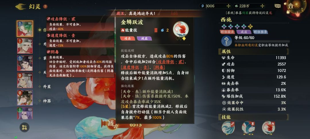 2. 西施(控制核心)——【五星.七星】+速度和命中套装,保证群体挂减速和推条稳定生效,配合鲲鹏形成“我方加速+敌方减速”的双重行动条压制。